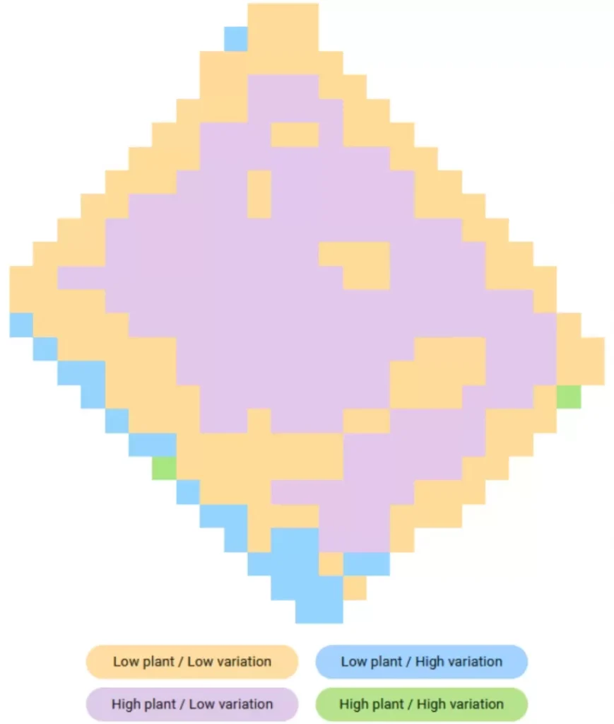 Performance Mapping: Detailed field maps with 10×10 meter pixel accuracy, showing plant performance and cover in detail.